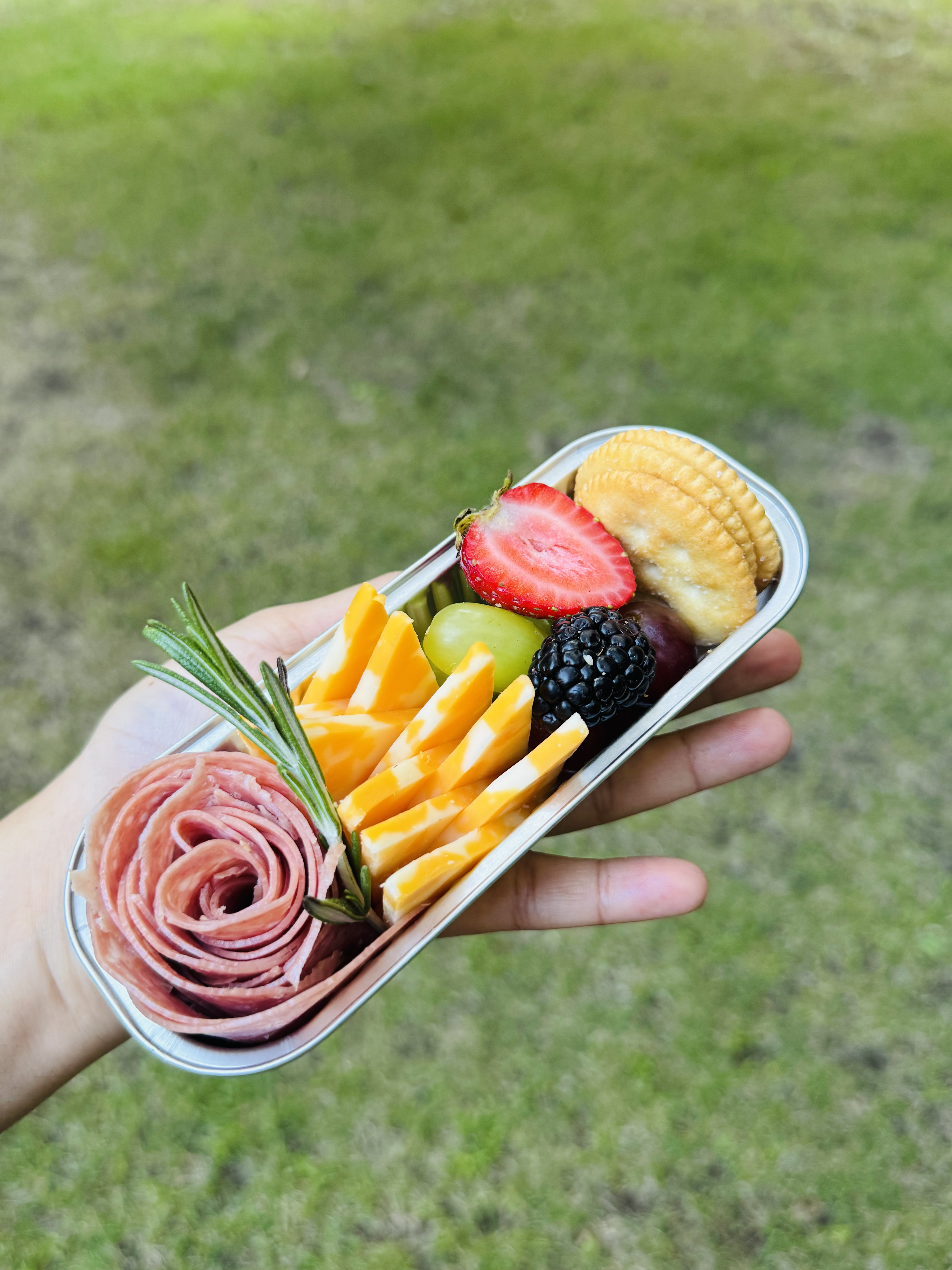 A portable cone filled with artisanal cheese, cured meats, and grapes—ideal for mingling at parties or casual gatherings.